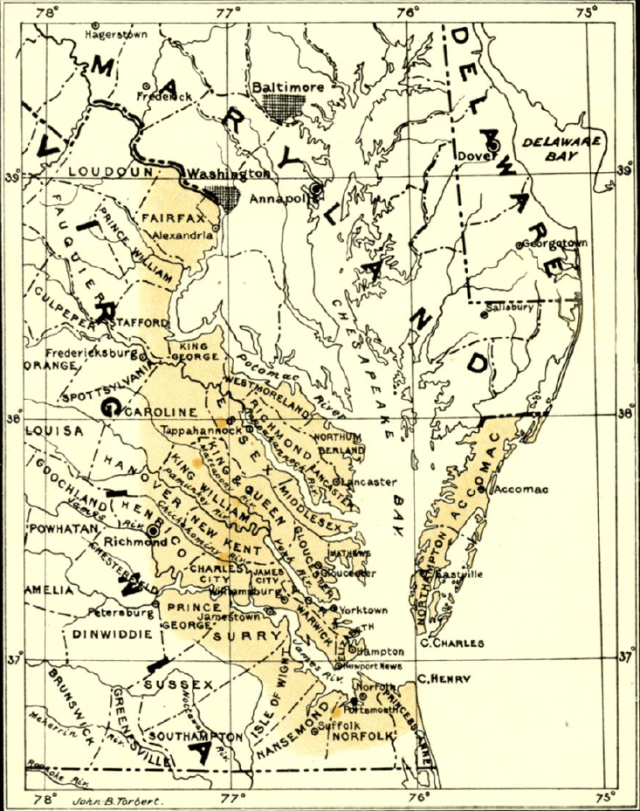 The map below, from his article, shows the range of the Powhatan Confederacy.  The yellow circles indicate the location of the bands existing at the time he wrote the article which was published in 1907.