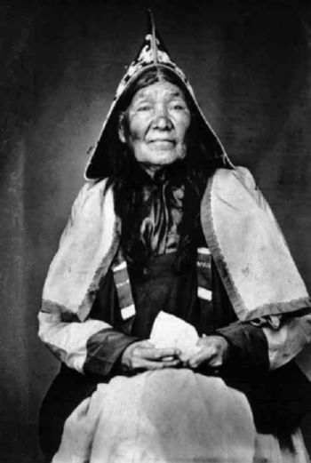 This picture, taken in the mid 1800s in Annapolis Royal is of Molly Muise who lived to a great age and was so much respected by her white neighbors that they erected a tombstone to her memory. Her dates of birth and death are not known. This may be the earliest portrait of a Mi’kmaq by a photographic process. Molly Muise (the name was originally the French ‘Mius’ and is now spelled Meuse and Muse as well) is wearing a peaked cap with double-curve beadwork, a dark shirt, a short jacket with darker cuffs, over which she apparently has draped a second short jacket, its sleeves pulled inside, as a capelet. Her traditional dress with the large fold at the top is held up by suspenders with ornamental tabs. In her hands she seems to be clutching a white handkerchief.
