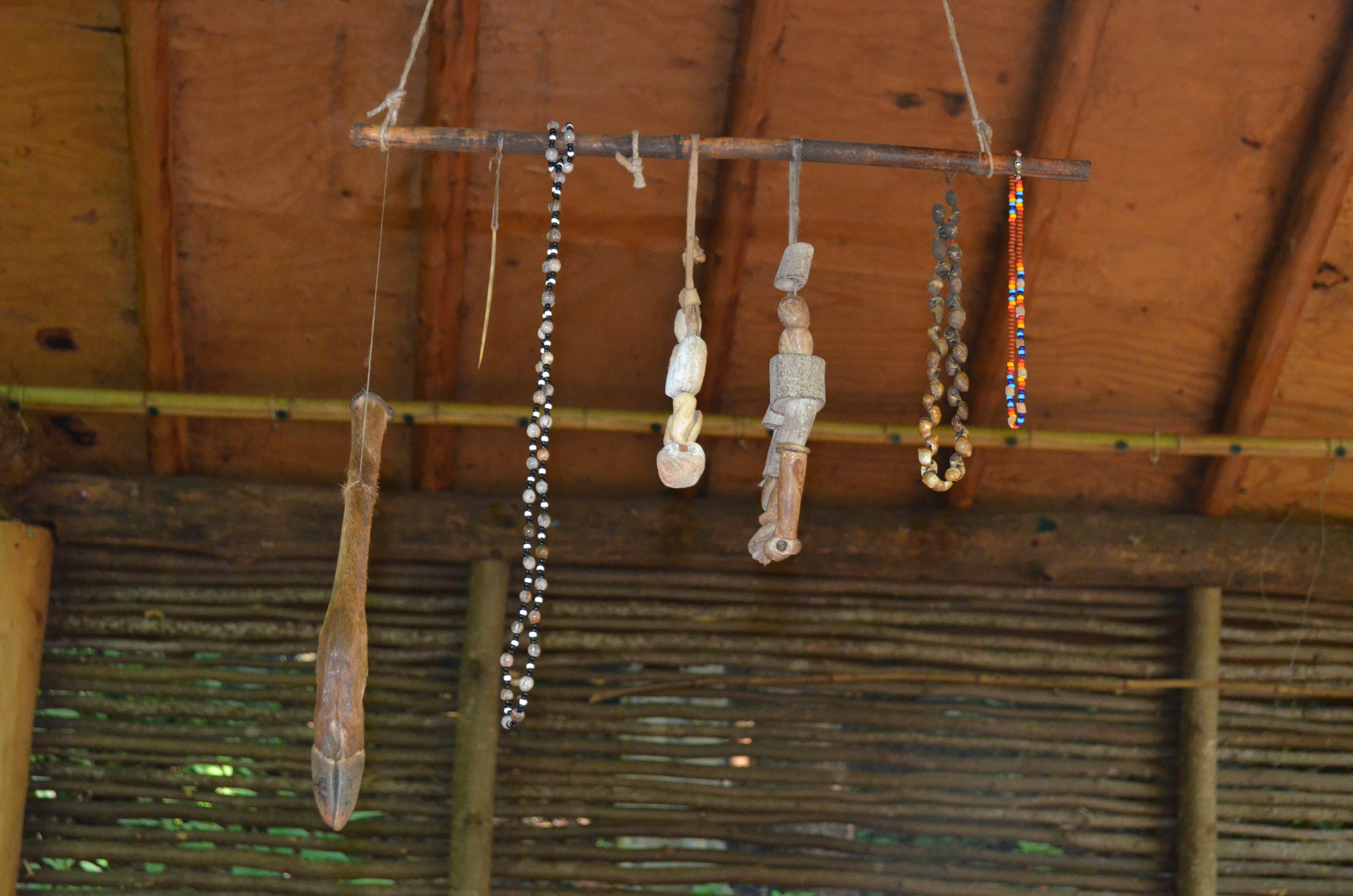 Today the beadworkers use contemporary beads like the rest of us, but traditionally the cornbead was used.  It grows on a plant called the cornplant and it is hard when harvested.  There are some traditional beaded items, before the advent of European beads.  The cornbeads are the grey stand near the left.
