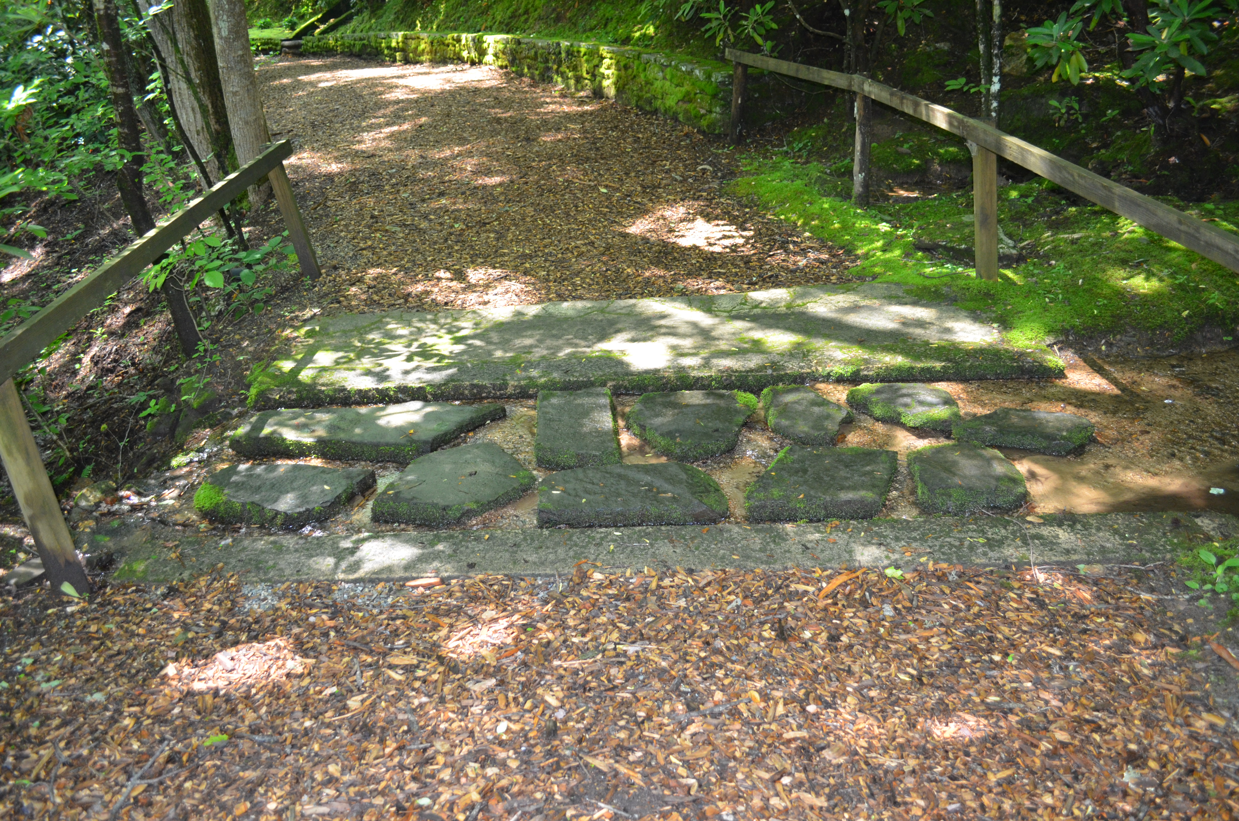 Above the village on the mountainside is a botanical gardens.  This was a lovely half hour hike.  You cross several streams and they also have a homestead with a Native garden.  The stream crossing below is not a bridge, but a walk across the stream itself.  Very unique.