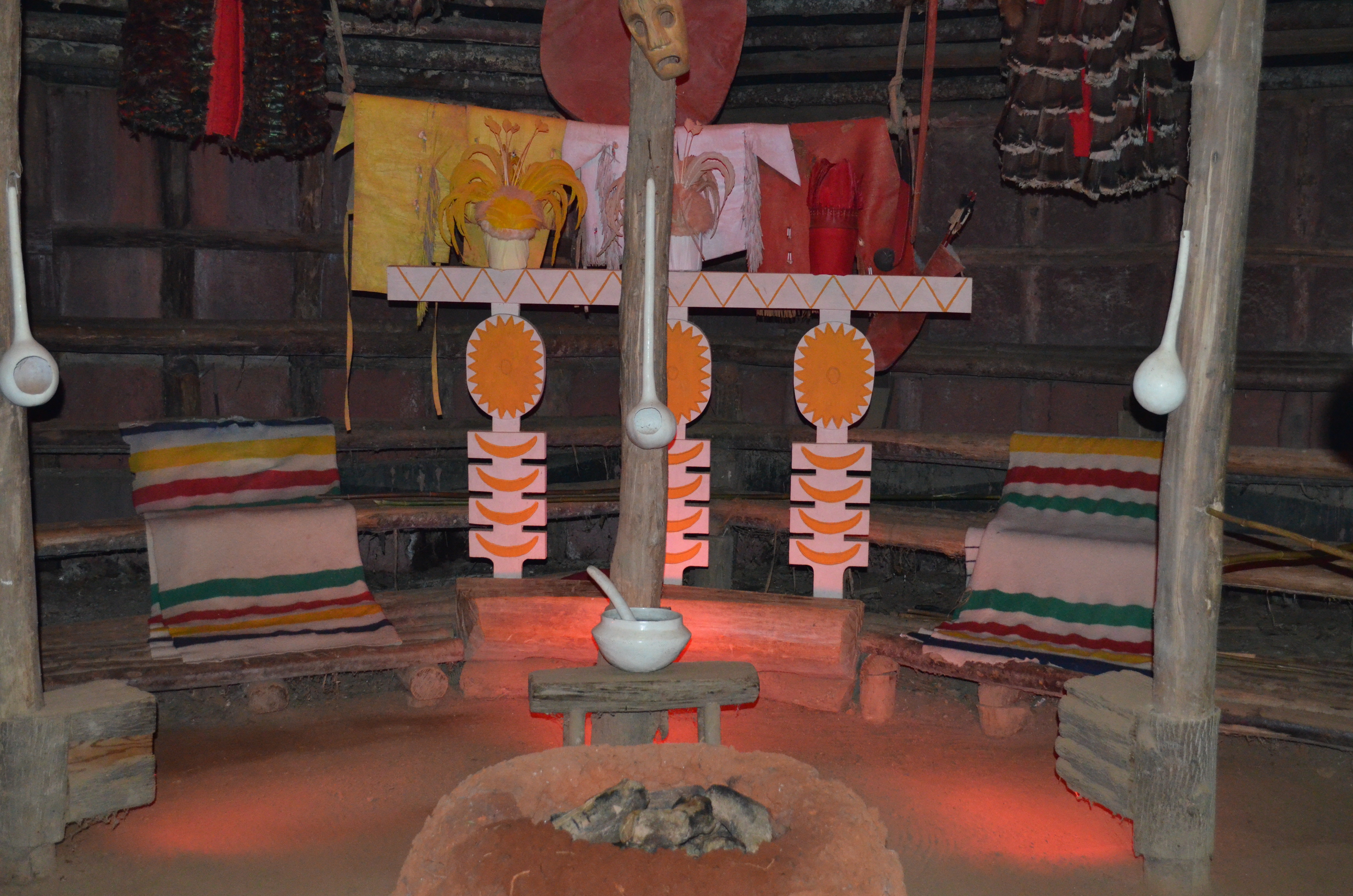 In the photo of the inside of the Council House below, the mound in the lower center which is about 3 feet high is the eternal fire.  Each year the women extinguish their fireplace fires and clean out the fireplace and them come to the Council House and get a new fire.  The fire in the Council House is never allowed to go out but the ashes are removed once a year as part of the renewal ceremonies.