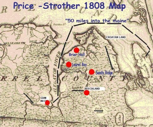 [7] Mary Wood Long in her book The Five Lost Colonies of Dare, p 69, states that “within the collection of Blount papers there is no mention of any village within the boundaries known as the Blount Survey other than the sections called Mashoes and Croatan.” She goes on to say that this is the area of Mann’s Harbor and thevillage ofMashoes today. These two areas on the coastline, not the interior. The Blount patent was apparently surveyed in 1796 as John Allen who was sent to survey the boundaries wrote to Blount that he had heard of a great forest of cypress in the wilderness but he himself had not seen it, inferring of course that he had not visited the interior. Blount’s patent was issued inWashington,NC in September of 1796.