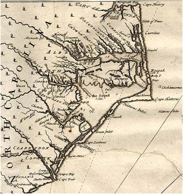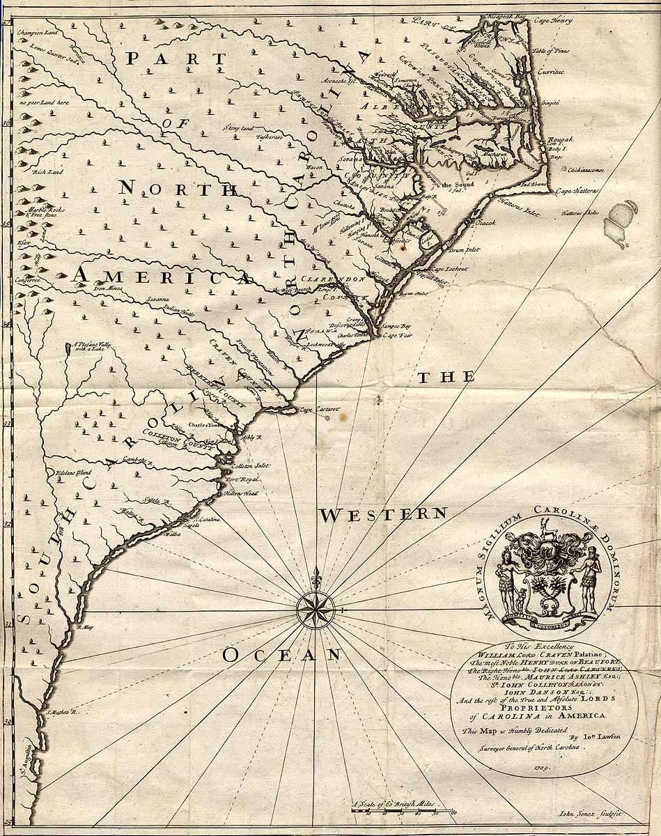 In his book, “A New Voyage to Carolina,” published in 1709, but compiled over the prior decade, John Lawson describes the colony’s flora and fauna and its various groups of American Indians. Lawson also publishes a map of Carolina.