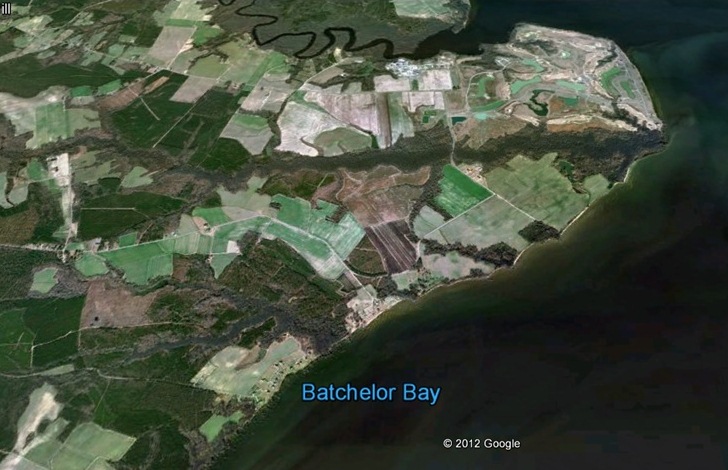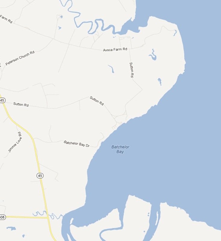 Let’s take a look and see what is there today. The area from NC45 to the Bachelor’s Bay development is a good candidate location. The road is about 2 miles long and this is just about the only place on that road where there is anything except forest until you get to the end where you find the Bachelor’s Bay development right on the sound.