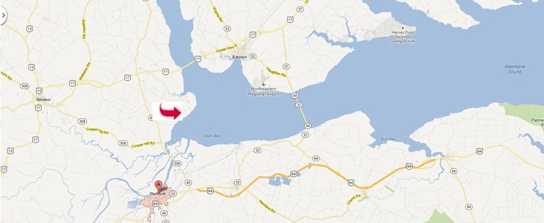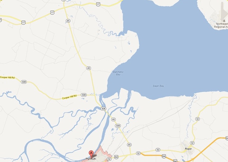 A closer view shows the road from Plymouth, crossing the Cashie, Middle and Roanoke Rivers where they join to form Swan Bay which is part of Albemarle Sound. The Chowan flows from the north and is the body of water that separates Bachelor Bay and Edenton.