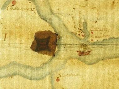This image of the fort icon was exposed on John White’s map at the confluence of the Roanoke and Chowan Rivers in present day Bertie County.