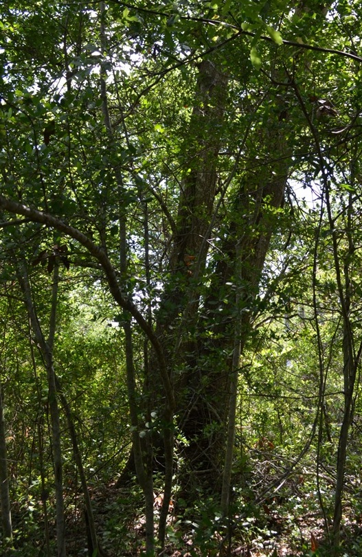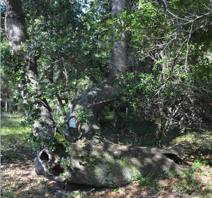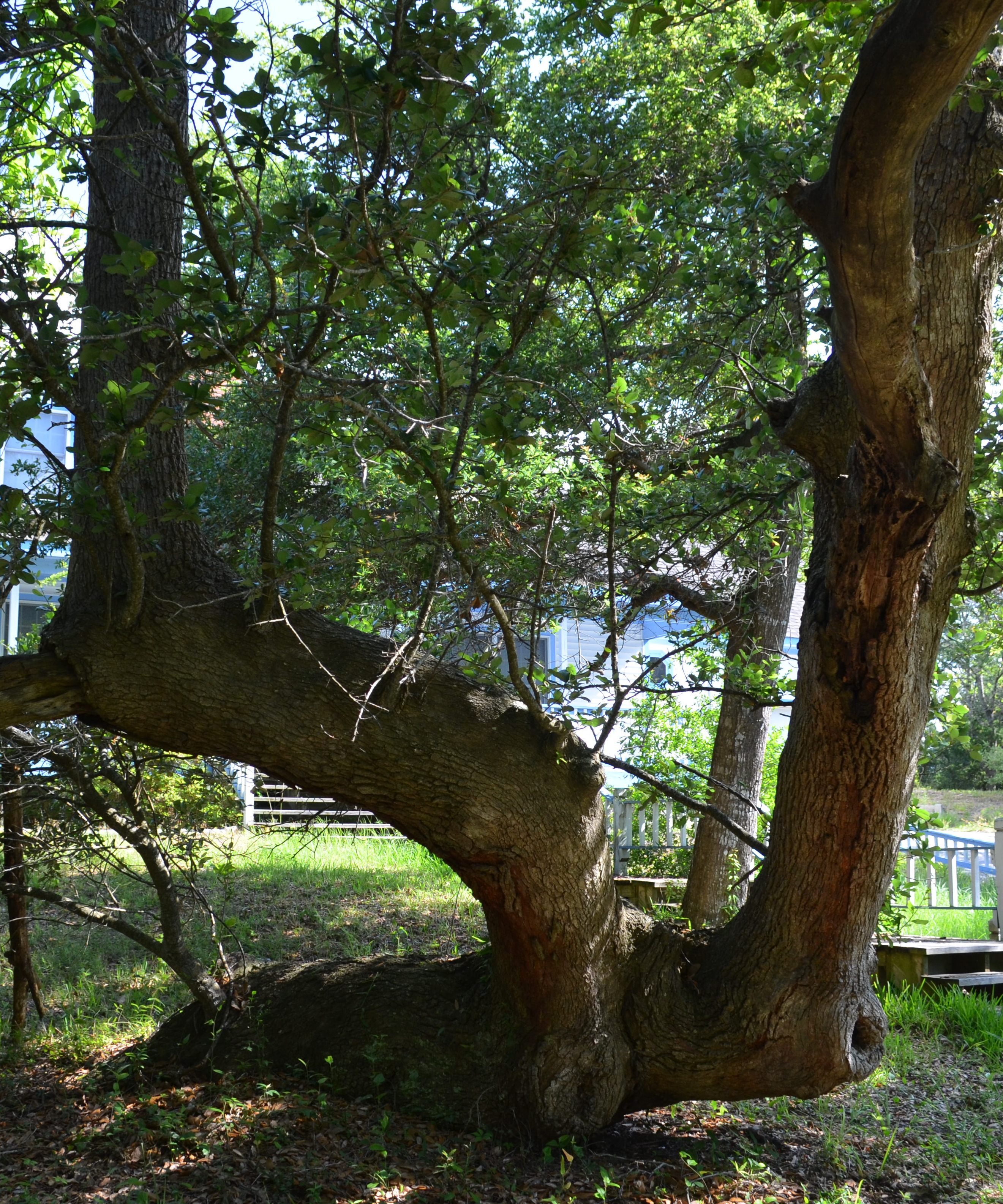 In the photo below, this tree is exactly where, using today’s property lines, we think the forked stump should be. But it’s not a stump and it doesn’t appear to be old enough, although we’ve been cautioned by tree experts not to compare Hatteras trees to other trees when determining age because the environment tends to stunt Hatteras trees, so they are older than they appear.
