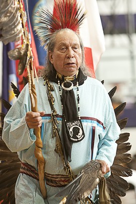Veterans are always a part of the Grand Entrance ceremony and there is almost always a “Head Veteran.” George Martin, below, at the Mother Earth Powwow in March, 2012, has been leading Michigan powwows for at least 30 years now as our beloved Head Veteran. At some point in the festivities, all veterans present are generally recognized as well.
