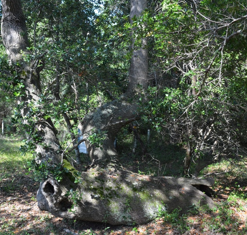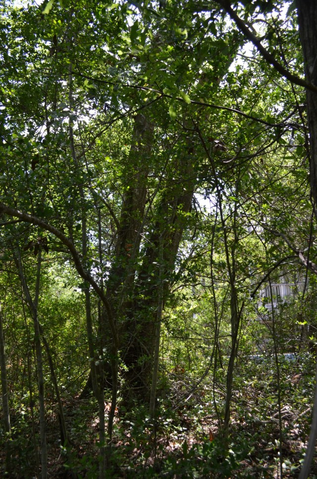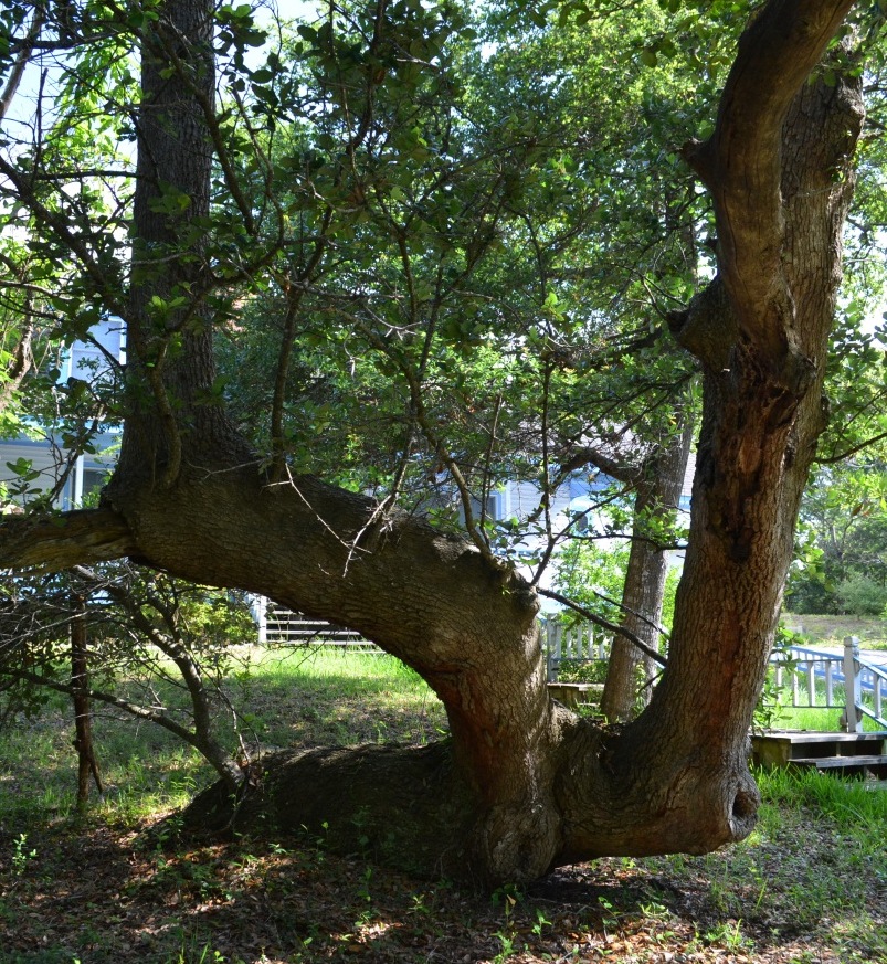 In the photo below, this tree is exactly where, using today’s property lines, we think the forked stump should be. But it’s not a stump and it doesn’t appear to be old enough, although we’ve been cautioned by tree experts not to compare Hatteras trees to other trees when determining age because the environment tends to stunt Hatteras trees, so they are older than they appear.