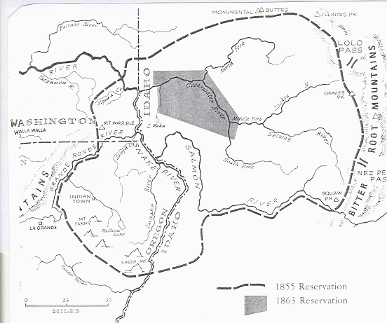 In 1855 U.S. Officials persuaded the Nez Perce to sign the Walla Walla Treaty in which they sold much of their lands for less than 8 cents an acre. The treaty ordered the Nez Perce to relinquish their ancestral territory and move to Oregon’s Umatilla Reservation with the Walla Walla, Cayuse, and Umatilla Tribes. However, all the tribes so opposed this plan that Territorial Governor Isaac Stevens granted the Nez Perce the right to remain in their own territory, on the condition that they relinquish nearly 13 million acres to the U.S. government. A large reservation (10,000 square miles) was established across central Idaho and into the Wallowa Valley of Oregon. Many of The People moved into Idaho. Some however remained in the Wallowa Valley. Among these was Old Chief Joseph and his band.