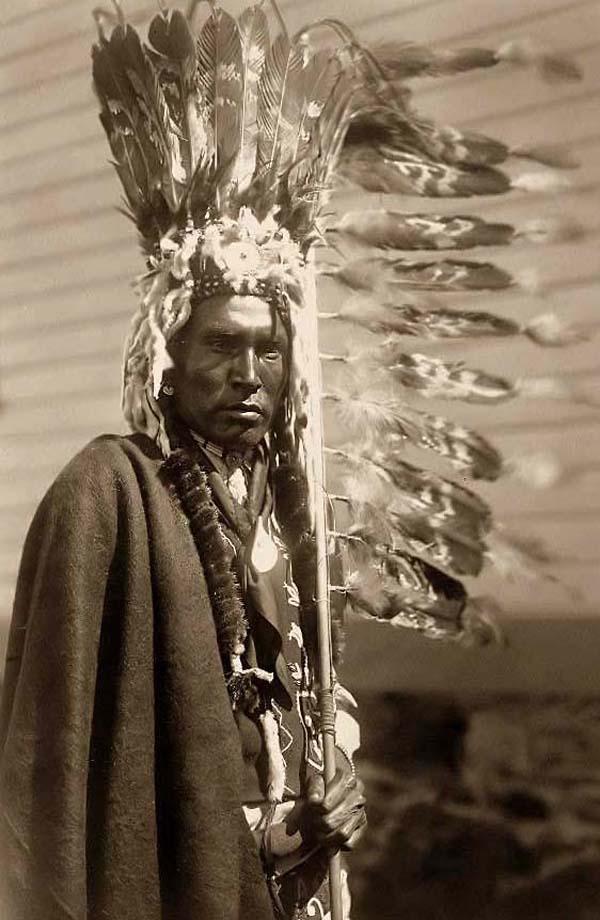 The photo above taken in 1910 by Edward Curtis shows a Piegan warrior wearing a war bonnet and holding a coup stick.
