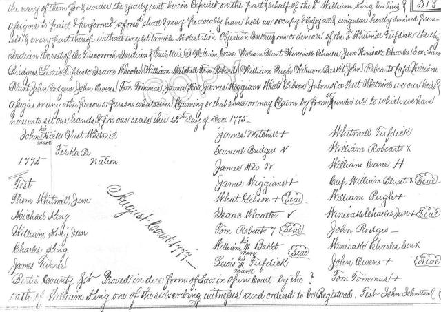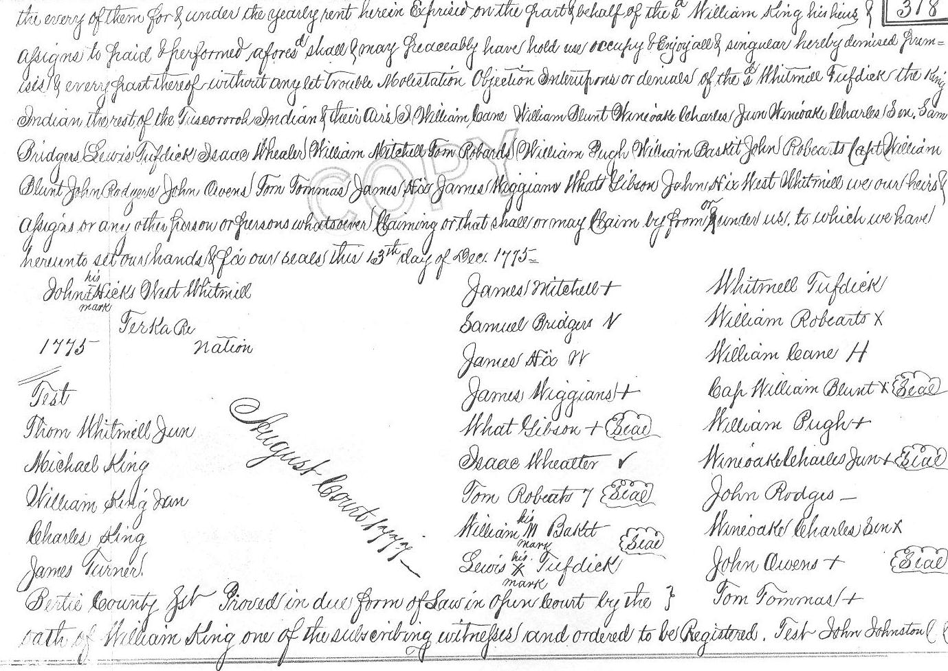 Dec 13, 1775, Whitmel Tufdick, “the King Indian” and the rest of the Tuscarora Indians and their airs (sic), William Cain, William Blount (Blunt in other iterations), Wineoak Charles Jr., Wineoak Charles Sr., Sam Bridges (Bridgers in other iterations), Lewis Tufdick, Isaac Wheeler (Whealer in other iterations), William Mitchell, Tom Robbard (Robards, Robarts in other iterations), William Pugh, William Baskit, John Robearts, Capt. William Blount (Blunt in other iterations), John Rodgers, John Owens, Tom Tommas (Tommor in other iterations), James Hix, James Wiggians, What Gibson, John Hix (not on first list in deed, but on the other two iterations), West Whitmell to William King for yearly rents, Town Swamp at beginning at the mouth of Lickign Branch…below Johnes…Worley Jones line, for 99 years.