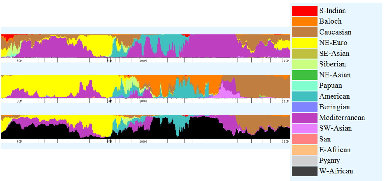 While this series is obviously focused on minority Native admixture, using my own Native admixture, contributed by both parents, as a working example, the same techniques work to identify majority admixture or minority admixture of any other ethnicity. It’s especially interesting if you have the DNA of at least one parent, because you can visually see and compare your DNA to theirs. This series shows you how to use the various tools available to do just that. An example of my DNA (top row) compared to my mother’s (second row) on a Native segment of a chromosome is shown below. The third row shows our matching DNA segments with the black indicating the part that doesn’t match, so the part that was contributed to me by my father.