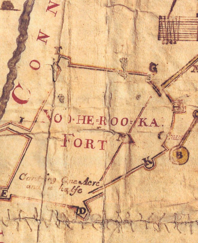 Fort Neoheroka was an irregularly shaped enclosure of one and one-half acres contained within a palisaded wall. Along this wall, at strategically located points, were bastions and blockhouses. Within the enclosure were houses and caves. An enclosed passageway, or “waterway,” led to the nearby branch of Contentnea Creek.