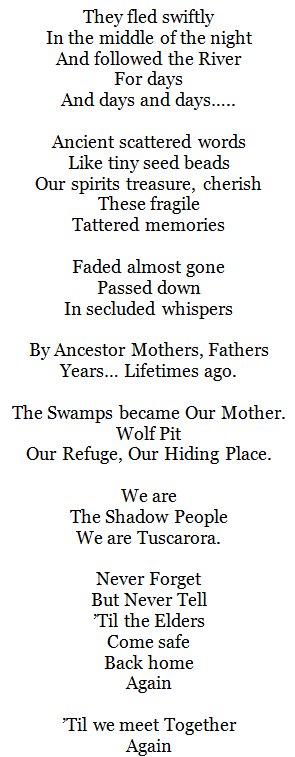 The series of events in the past few days and months have come together to offer a wonderful opportunity to preserve the heritage of the Tuscarora people as a whole, with the dedication of a memorial at Fort Neoheroka, commemorating and honoring the Tuscarora who fell there 300 years ago.  But not all fell, and not all died.  Not all went north in the migration that spanned the next 90 years.  The stories of those who stayed are written in the blood of the people, their descendants, in the obscured records and in the stories, still maintained by those Sacred Memory Keepers who we all know and love as both distant and close family members today.