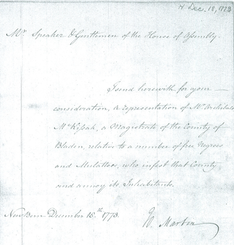 On December 18, 1773 the Governor sent a message to the Assembly enclosing a letter from Archibald McKissack, a justice of Bladen County, “relative to a number of free negroes and mulattoes who infest that county and annoy its inhabitants.”