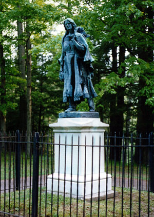 When the reservation was closed and the burial ground there threatened, her grandchildren turned to William Pryor Letchworth, whose estate, Glen Iris, encompassed the land where Sehgehunda had been. He immediately invited them to bring Mary home. Her remains were placed in a new walnut coffin and taken back to the Genesee Valley. A full ceremony was held at the old Seneca council house, and she was laid to rest in March of 1874. Letchworth erected a granite marker, on top of which is a statue which he dedicated in 1910, after his estate had been incorporated into Letchworth State Park in present day Castille, New York.