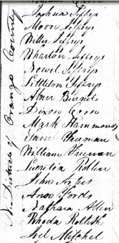 The 1810 census for Orange County shows the Jeffreys family in the Hillsborough District of Orange County. The 1810 classification for free people of color was “all others.” People in the Hillsborough District under this classification were as follows: