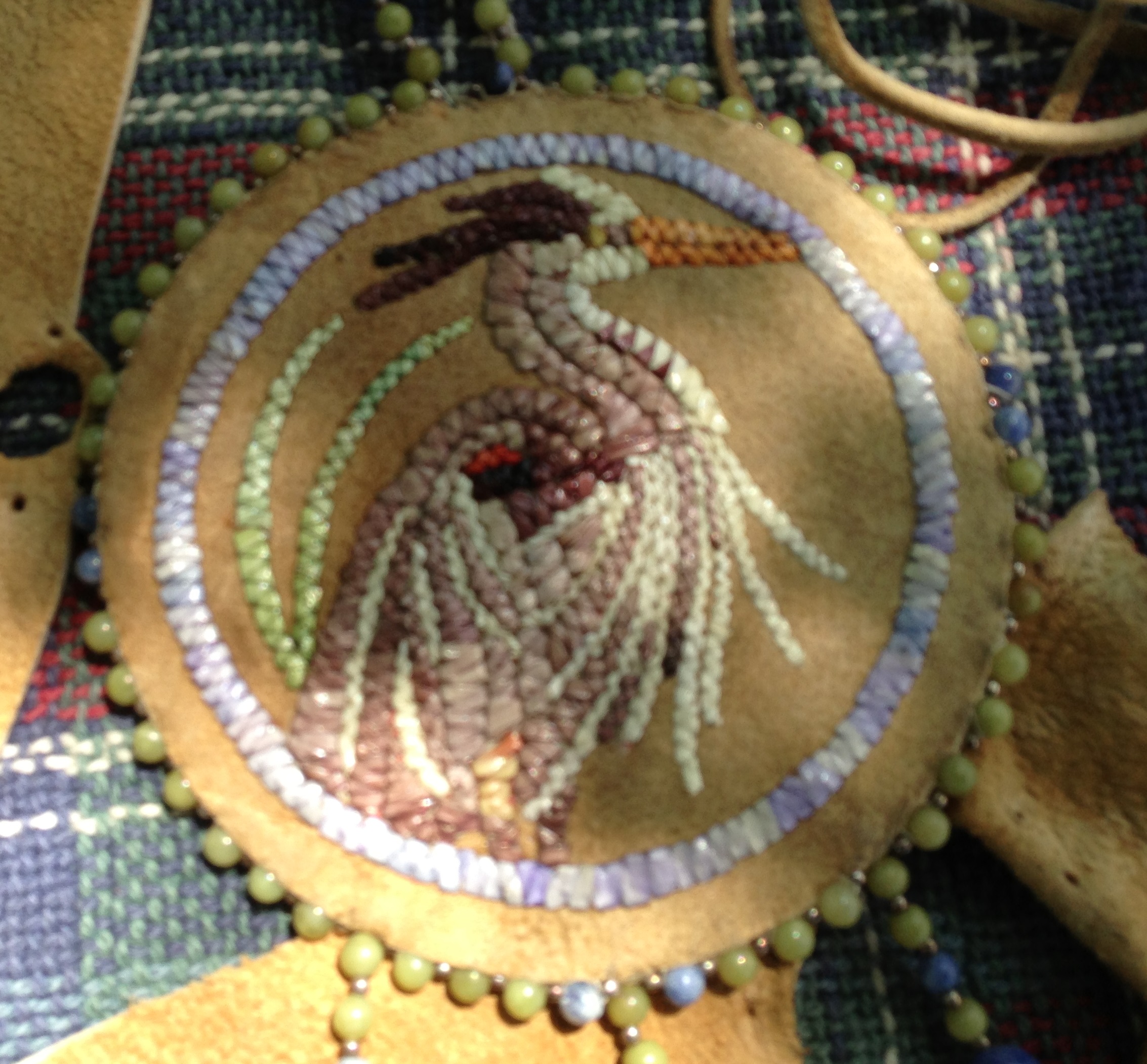 I learned quillwork from the ground up…literally…picking up fresh roadkill, plucking, cleaning and dying my own quills, sometimes using natural dyes, sometimes using RIT dye. I only quill on braintan leather and though I know how to tan my own hides, I leave that task to my friend Dan Vogt of IL because the physical labor it entails is too hard on my hands. While I can sew in historic fashion using only the old methods, I prefer to use a more modern, single-needle technique which makes it quicker and ultimately more affordable but the result is identical to the old way. I have been called on to do restoration of historic items but most of my own work is concentrated on animals, giving life & spirit to each piece with a realism few others do.”
