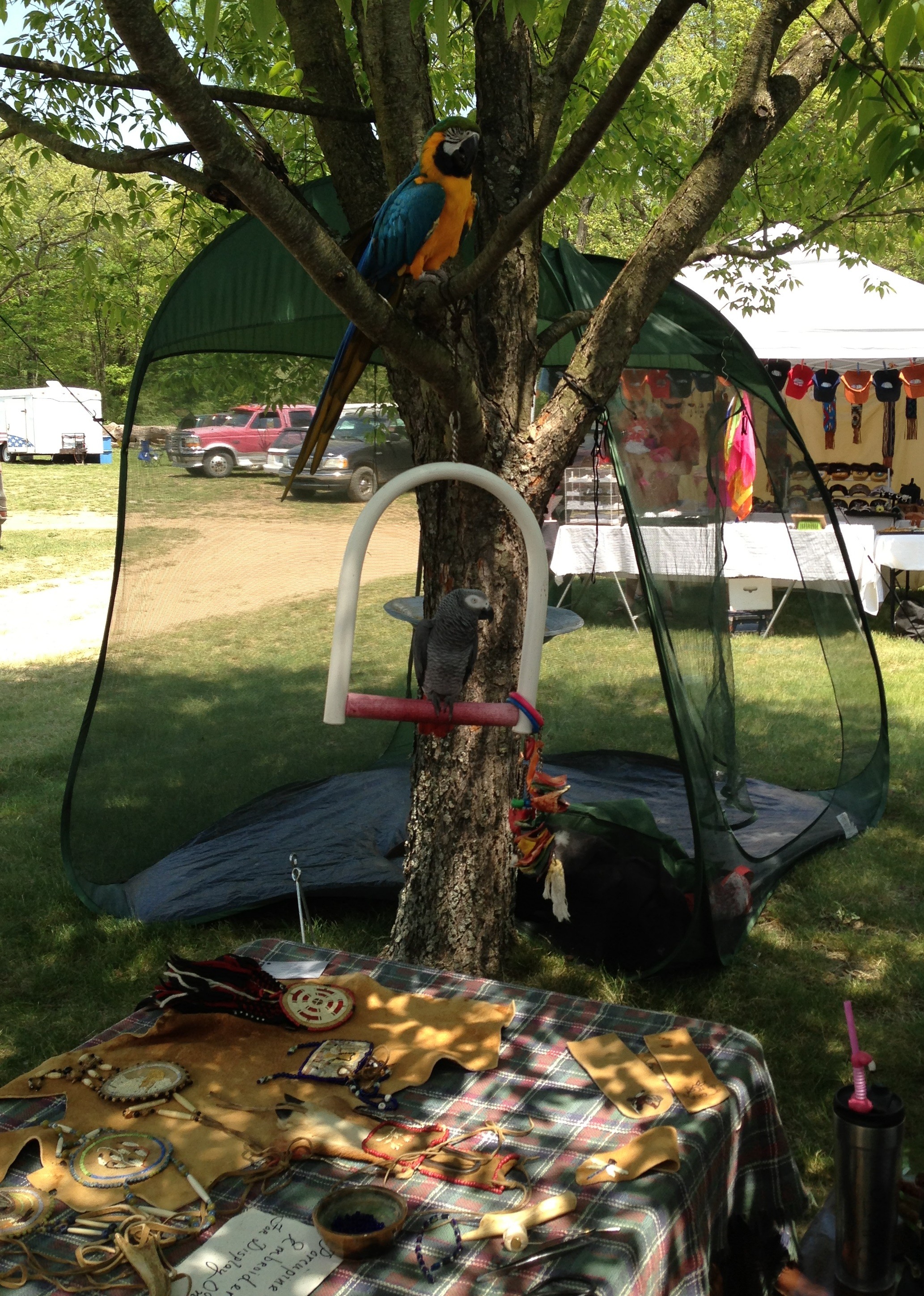 As you can see, Bonita’s table where she works and displays her wares is right here, beside Abby and Shaka, and she keep an eye on both, much like a couple of feathered toddlers.