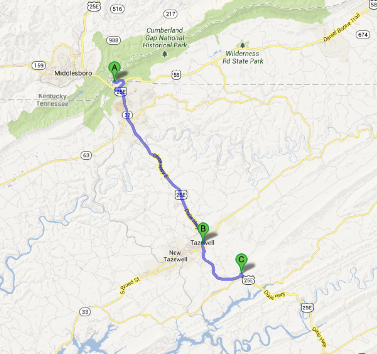During the Civil War, the battle of Tazewell, TN, took place beginning on August 2nd, 1863. It happened outside of Tazewell, TN at the current location of the intersection of US 25E and Lone Mountain Road where it becomes Little Sycamore Road at Springdale. This location is about 15 miles south of Cumberland Gap. On the map above from the Civil War, Tazewell is shown at the bottom right. On the contemporary map below, the town of Cumberland Gap (A), Tazewell (B) and Springdale (C) are shown.