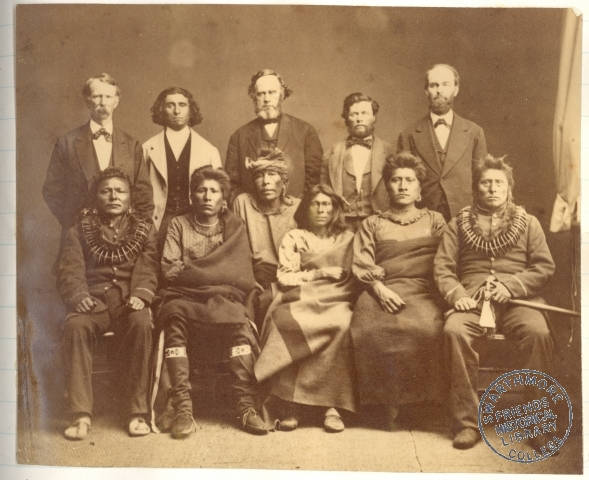 Photograph probably taken in 1871 of a group of Pawnee prisoners that were accused of the murder of a white man, McMurtie, along with their chiefs, interpreters, legal counsel, and Quaker indian agents.