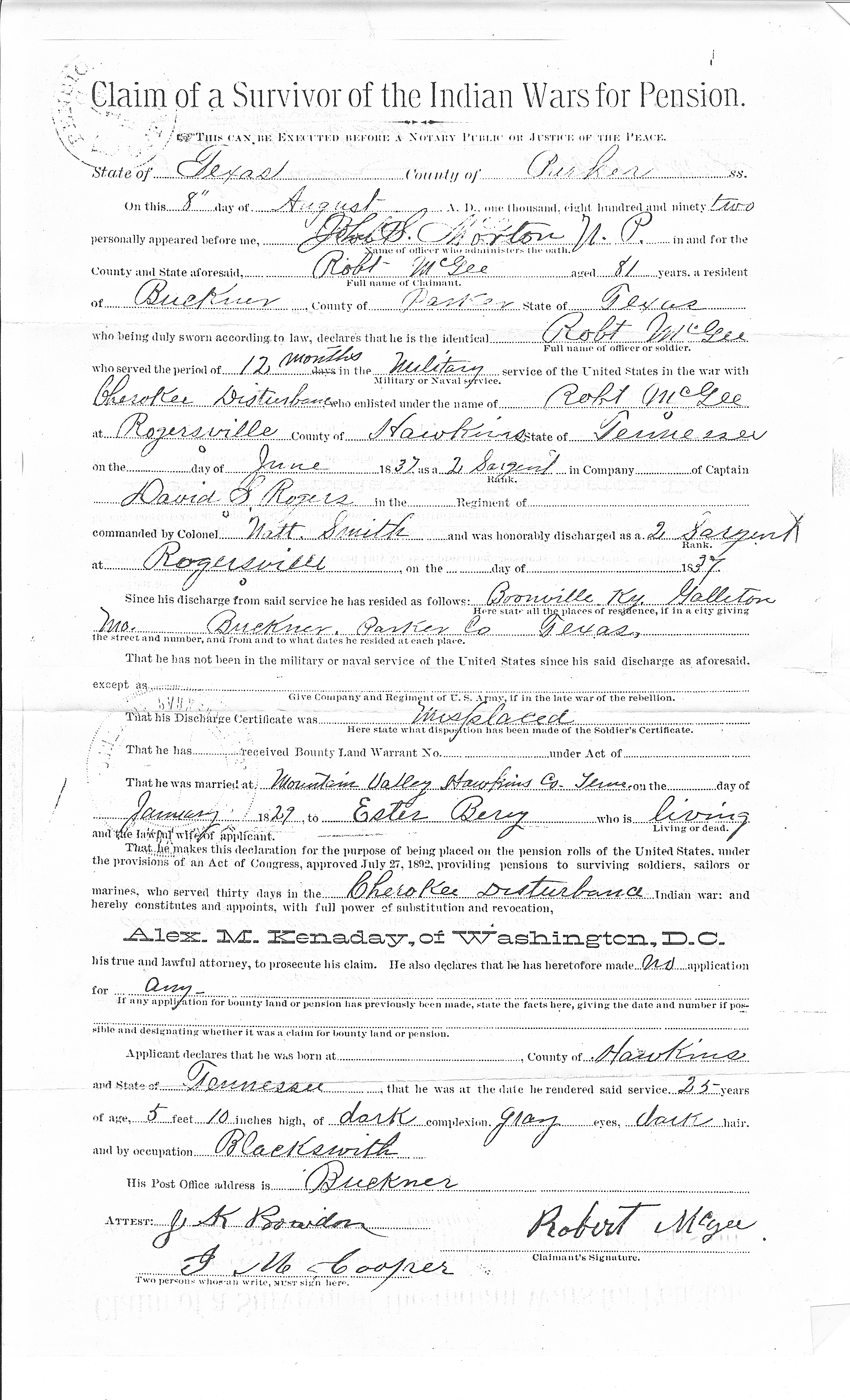 It’s a one page form completed by Robert McGee, age 81 who lived in Buckner, Parker County, Texas in August 1892 when he applied for a pension. On July 27, 1892, Congress provided pensions to surviving soldiers who served 30 days or more in the “Indian Wars.”