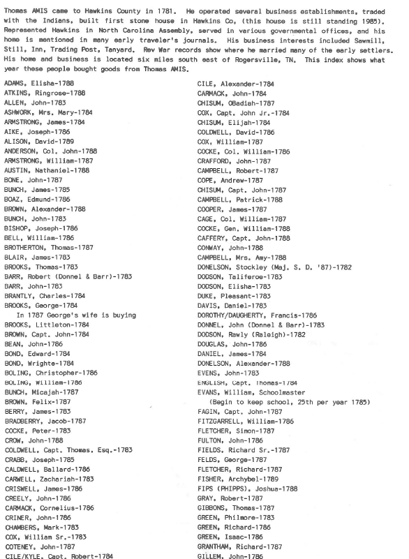 In 1780/1781, Colonel Amis built a fort at Big Creek, on the outskirts of the present-day Rogersville which was then in Sullivan County, NC.