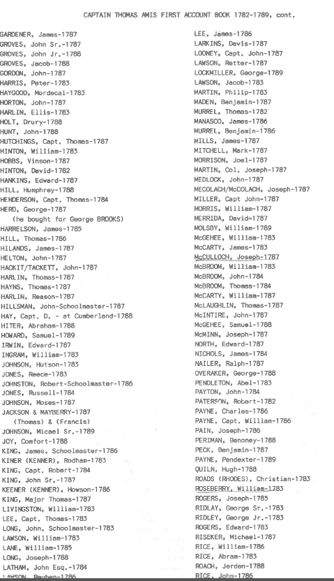 Thomas Amis also kept an account ledger book which is, thankfully, still in existance. This is one of the only documents that shows who lived in this area in the early years.