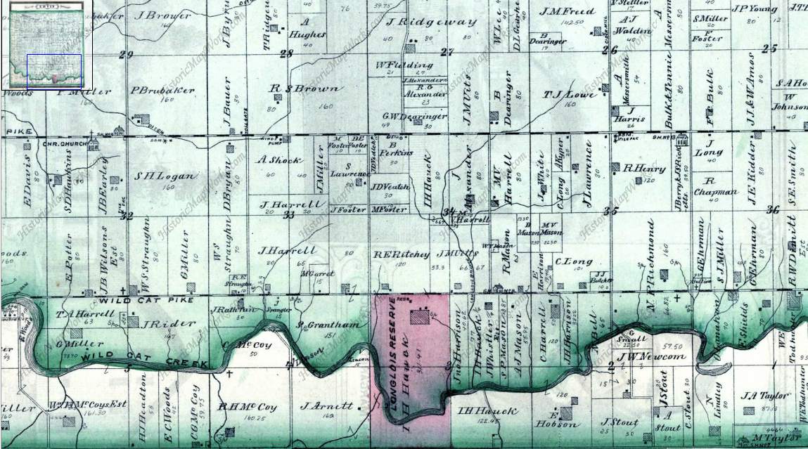 There were other Miami Villages in this general region as well, based on the 1877 Howard County Historical Atlas. Nip Po Wah lived at Vermont and Shoc Co To Quaw at Greentown. Pete Cornstalk lived at Indian Suck (the southeast corner of Ervin Twp.) and Ma Shock O Mo south of Greentown a mile and a half; Shap Pau Do Sho which meant “Through and Through,” was at Cassville.