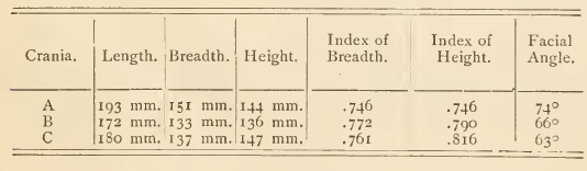 But two of the crania (A and B of the following table) obtained from this mound were sufficiently well preserved for measurement; and both of these, as shown by the teeth, are skulls of adults. C of this table is the skull of an adult taken from mound No. 2. below.