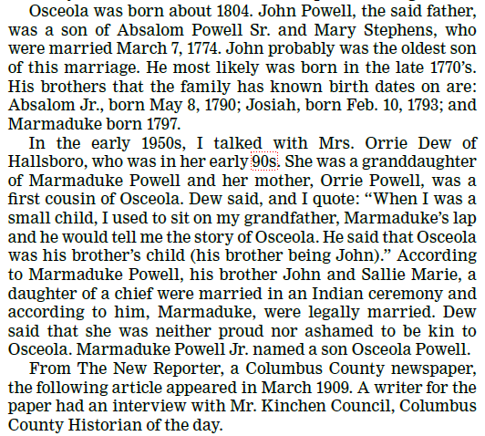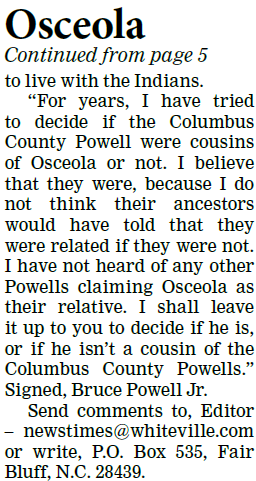 The News Times in Fair Bluff, NC recently ran an article about Osceola, a Seminole Indian Chief who was born to a Creek or Waccamaw mother.  His white name was either John or Billy Powell, depending on who is telling the story, and he is often referred to as Osceola Powell.  Bob Morgan researches Osceola and turns to the Powell family historian for more information.