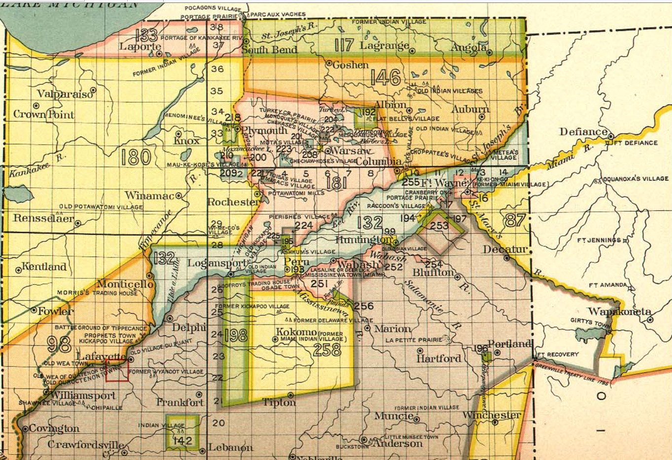 Unfortunately, it does not include any of the earliest cessions, before the Revolutionary War. This means that Virginia, for example, and most of North Carolina are missing from the maps. However, in many states, locations of current and former villages are clearly marked, such as this map of Indiana.