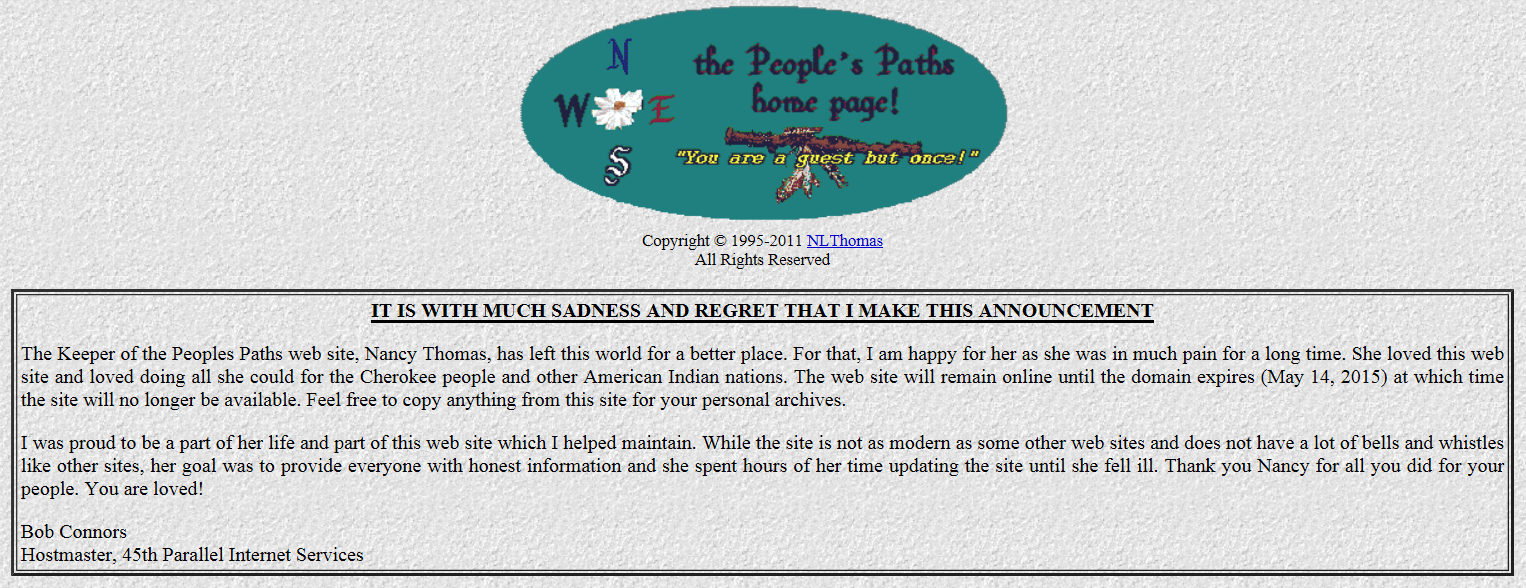 The People’s Path webpage was created in the 1990s to provide resources to Cherokee researchers, although there are resources from many other tribes included.  Just scanning, I see Ojibwa, Micmac, Lumbee, Navajo and lots more.  There is truly a wealth of informational sources.