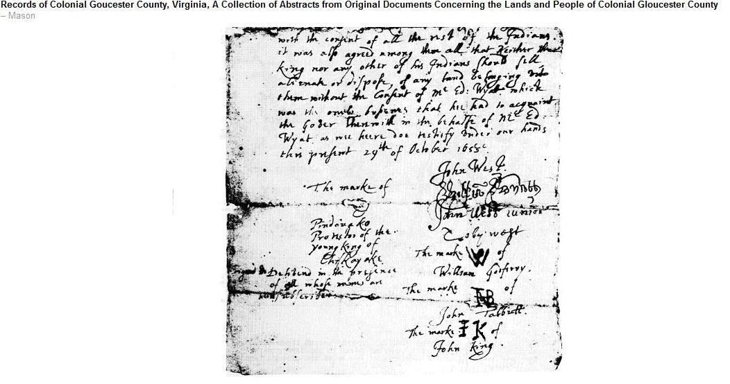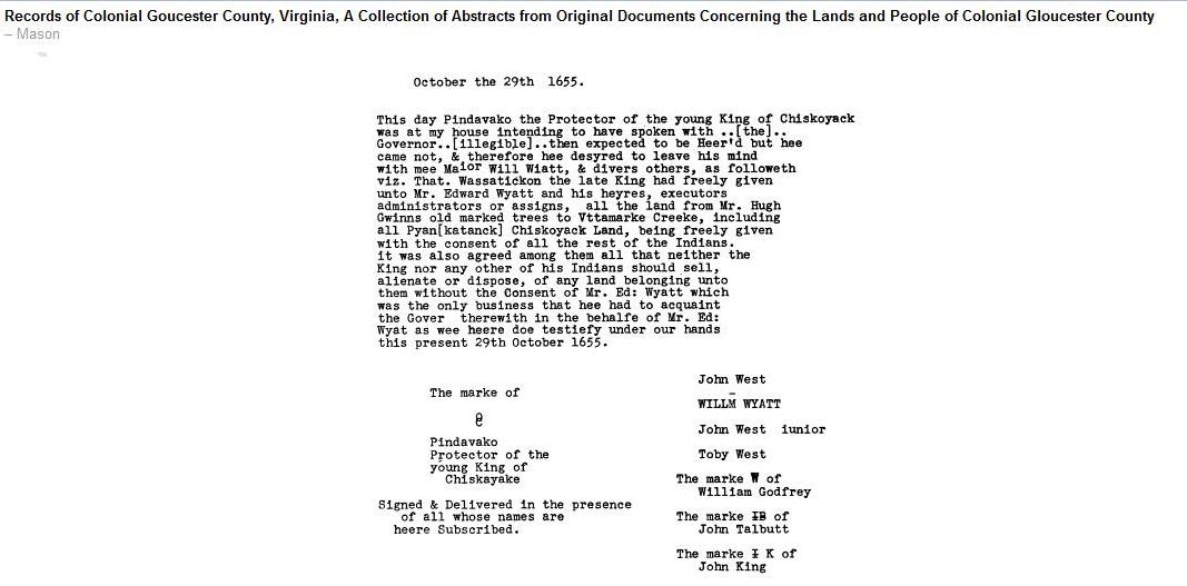 A reader sent these two images of a 1655 transaction in Goucester Co. VA – one of which is transcribed. Interestingly, I have never run across this tribe or the reference to the Chiskoyack before.
